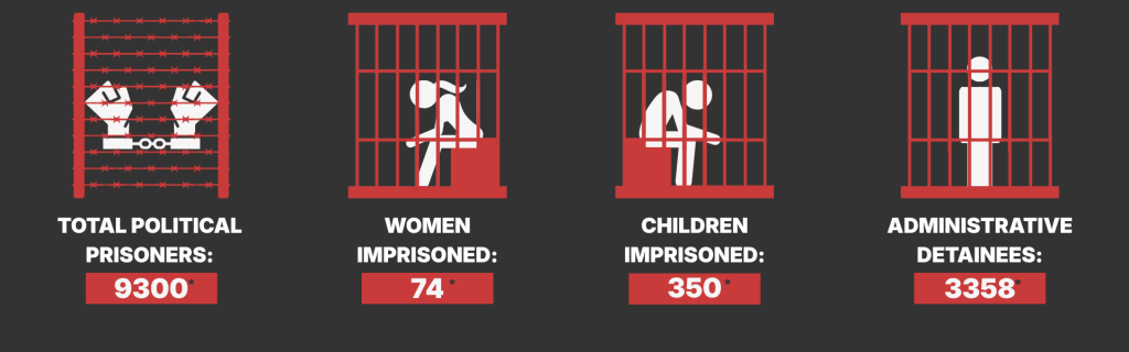 Palestinians face some of the highest rates of incarceration of any population in the world: one in five Palestinians has been imprisoned by Israel at some point in their life – 20% of the population.